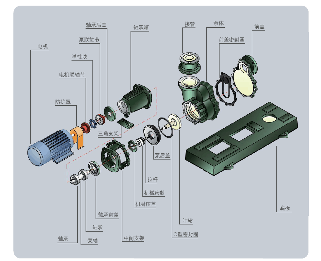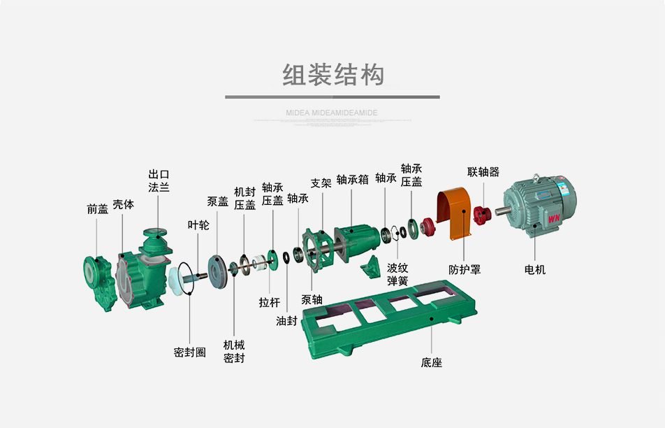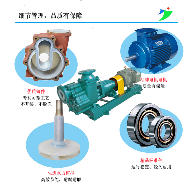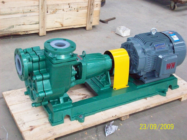 部件全部采用氟塑料合金制造,泵蓋、葉輪等均用金屬嵌件外包氟塑料整體燒結(jié)壓制而成,軸封采用外裝式