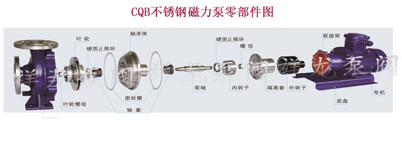 CQB型磁力驅動離心泵(簡稱磁力泵),通常由電動機,磁力偶合器和耐腐蝕離心泵組成。其主要特點是利用磁力偶合器傳遞動力,完全無泄漏,當電動機帶動磁力偶合器的外磁鋼旋轉時,磁力線穿過問隙和隔離套,作用于內(nèi)磁鋼上,使泵轉子與電動機同步旋轉,無機械接觸地傳遞扭矩。在泵軸的動力輸入端,由于液體被封閉在靜止的隔離套內(nèi),沒有動密封因而完全無泄漏。